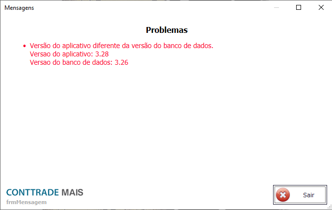 Quando os executáveis na pasta estão em uma versão, como 3.28, e seu banco de dados está em uma versão anterior, como 3.26, você pode encontrar o seguinte erro: "Versão do aplicativo difere da versão do banco de dados".