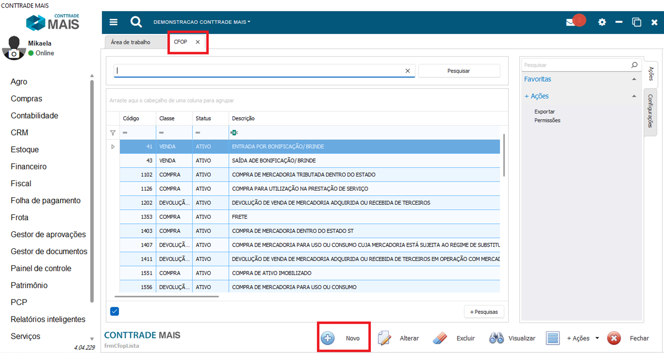 2° Já com a tela CFOP aberta é possível realizar o cadastro do CFOP através do botão “NOVO"