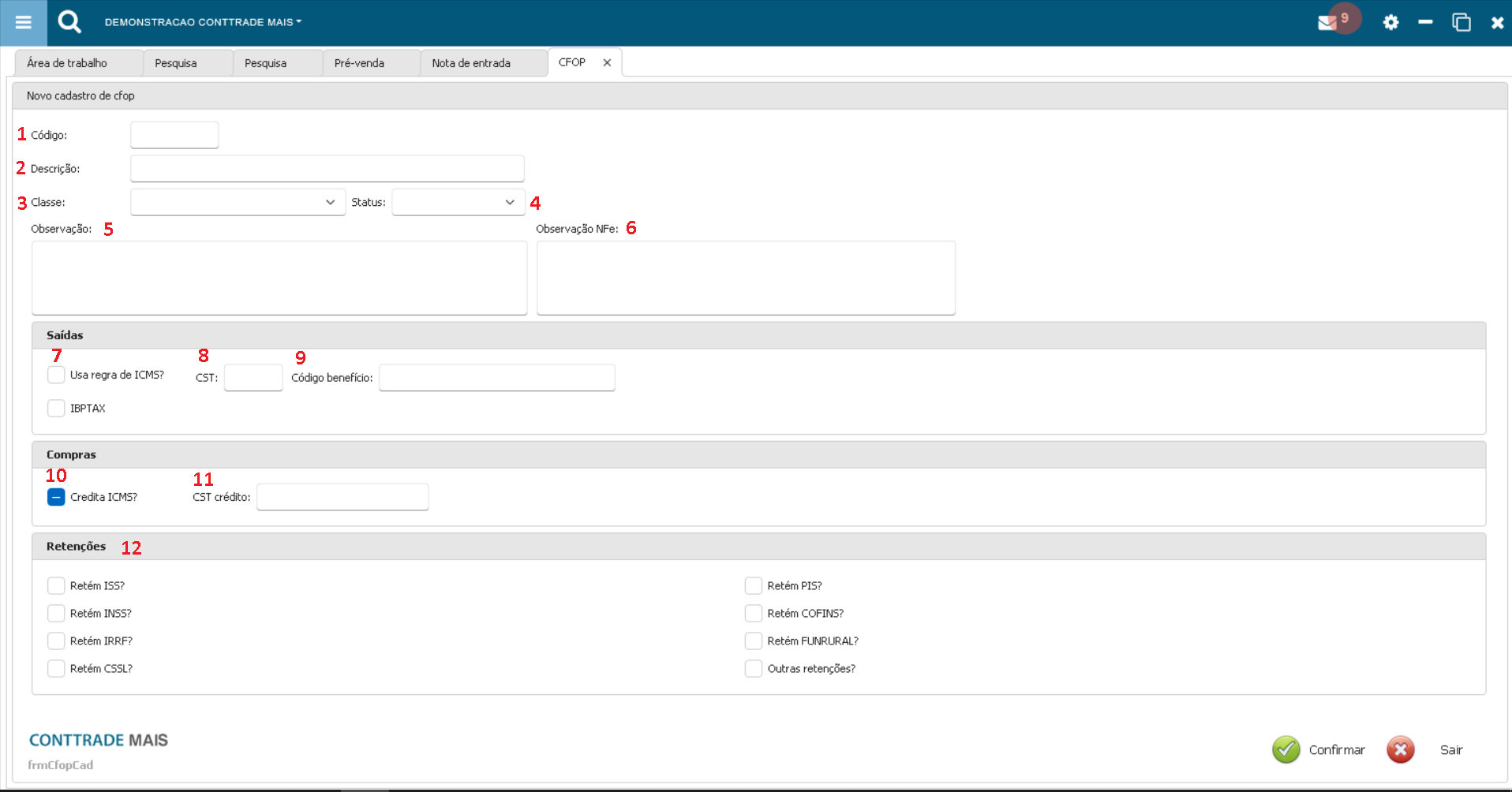 3. Nessa tela será realizado o cadastro do CFOP. Será necessário preencher as informações abaixo conforme itens numerados: