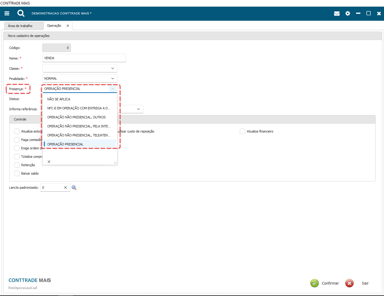 6° Presença é utilizado para indicar se a operação é presencial ou não e deve ser selecionado conforme opções presentes no sistema: