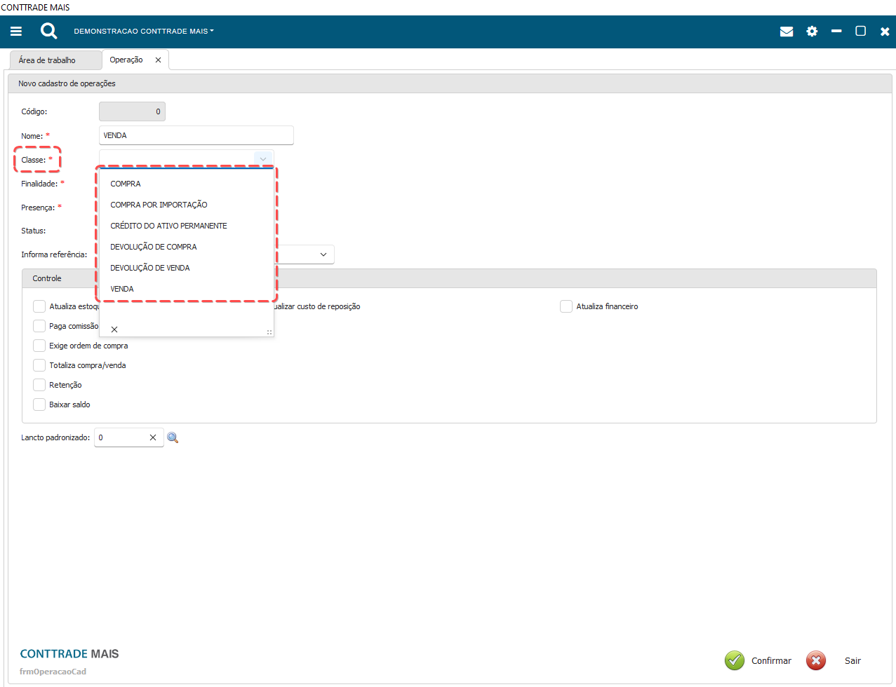 4° Selecione a Classe conforme as opções disponíveis, o próprio nome da classe já diz respeito ao que ela irá representar dentro da operação. Se é uma operação de venda, logo a classe será "venda".