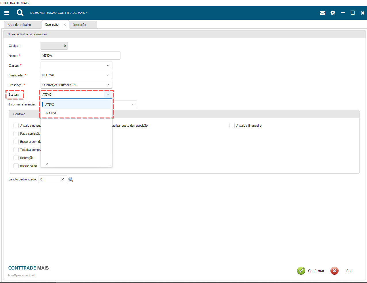 7° O Status deve ser informado de acordo. A a operação deverá estar disponível para uso: ATIVA NÃO disponível para uso: INATIVA.